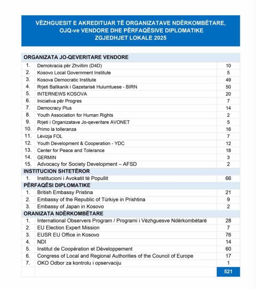 Komisioni Qendror i Zgjedhjeve (KQZ) në mbledhjen e kësaj të mërkure mori vendim për akreditimin e 521 vëzhguesve, për vëzhgimin e Zgjedhjeve Lokale për Kryetarë të Komunave dhe për Kuvende Komunale, të cilat do të mbahen më 12 tetor 2025, raporton Ekonomia Online.