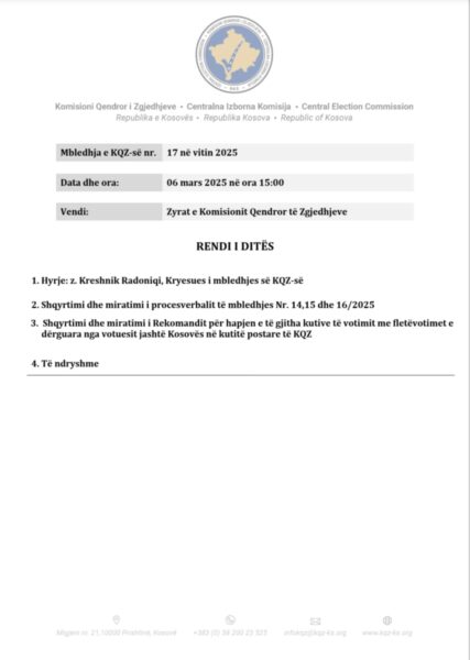 Ndër to edhe shqyrtimi dhe miratimi i Rekomandimit për hapjen e të gjitha kutive të votimit me fletëvotimet e dërguara nga votuesit jashtë Kosovës në kutitë postare të KQZ-së.
