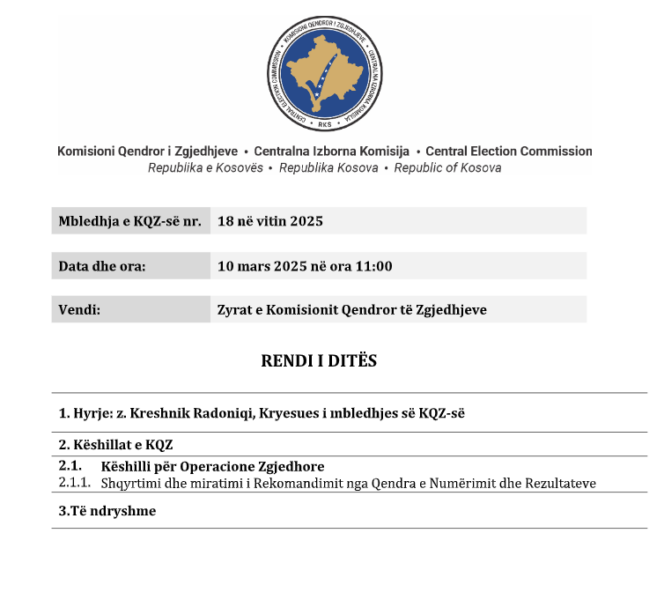 Komisioni Qendror i Zgjedhjeve do të mbajë mbledhje sot nga ora 11:00.