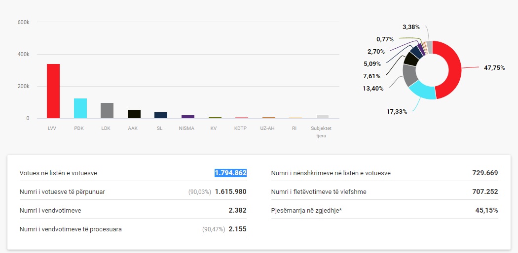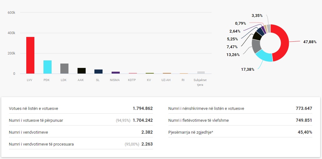 Sipas të dhënave të KQZ-së, Lëvizja Vetëvendosje prin bindshëm në këto zgjedhje me 47,75 për qind.