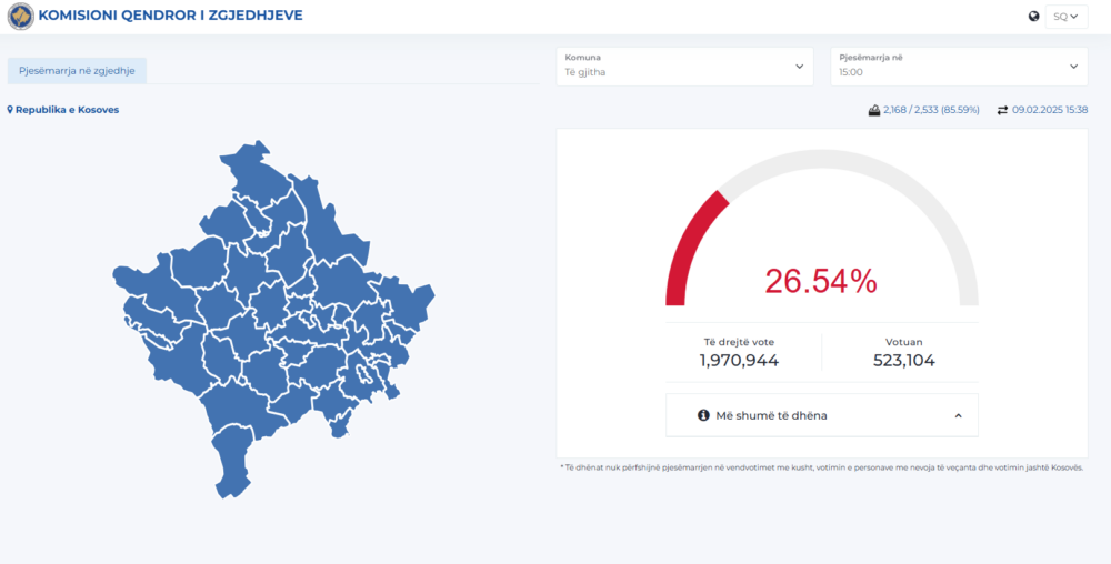 Në përditësimin e fundit që është bërë në orën 15:38 në web-faqen e KQZ-së, thuhet se kanë votuar 523,104 votues, apo 26.54%.