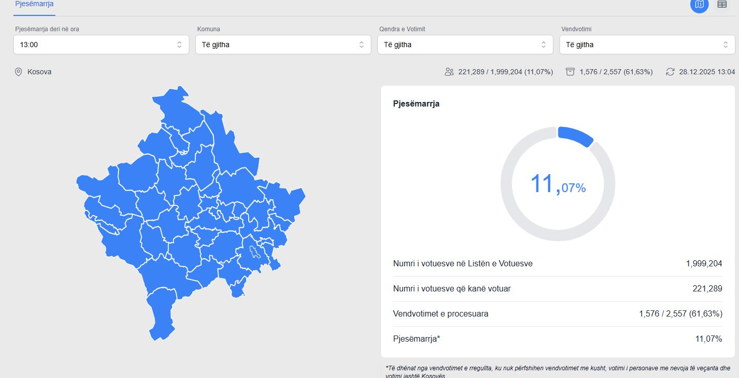 Komisioni Qendror i Zgjedhjeve ka publikuar të dhënat më të reja mbi pjesëmarrjen e qytetarëve në zgjedhje deri në orën 13:00.