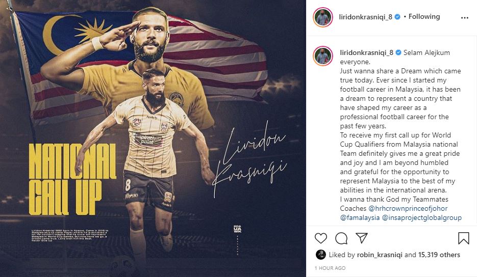 “Vetëm desha ta ndaj me ju ëndrrën e cila u bë realitet sot. Që kur e nisa karrierën time në Malajzi, ka qenë ëndërr që ta përfaqësoja vendin që i dha formë karrierës sime profesioniste si futbollist në vitet e fundit. Ta marr ftesën e parë për kualifikimet e Botërorit nga ekipi kombëtar i Malajzisë definitivisht më jep krenari dhe gëzim dhe jam i përulur dhe falënderues për mundësinë që më është dhënë ta përfaqësoj Malajzinë me të gjitha mundësitë dhe aftësitë e mia në arenën ndërkombëtare. Dëshiroj ta falënderoj Zotin, bashkëlojtarët dhe trajnerët”, ka shkruar 29 vjeçari në rrjetet sociale.