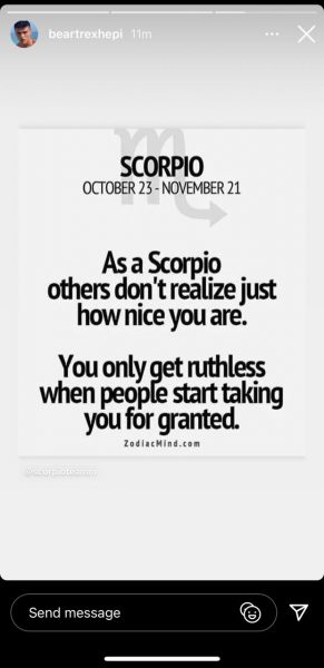 Menjëherë pas këtij thumbi u “kundërpërgjigj” Bearti, i cili publikoi në InstaStory një fotografi të shenjës së tij të horoskopit.
