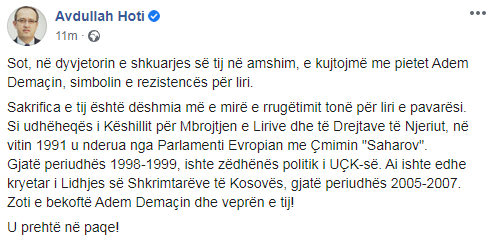 “Gjatë periudhës 1998-1999, ishte zëdhënës politik i UÇK-së. Ai ishte edhe kryetar i Lidhjes së Shkrimtarëve të Kosovës, gjatë periudhës 2005-2007”, ka shkruar Kryeministri Hoti.