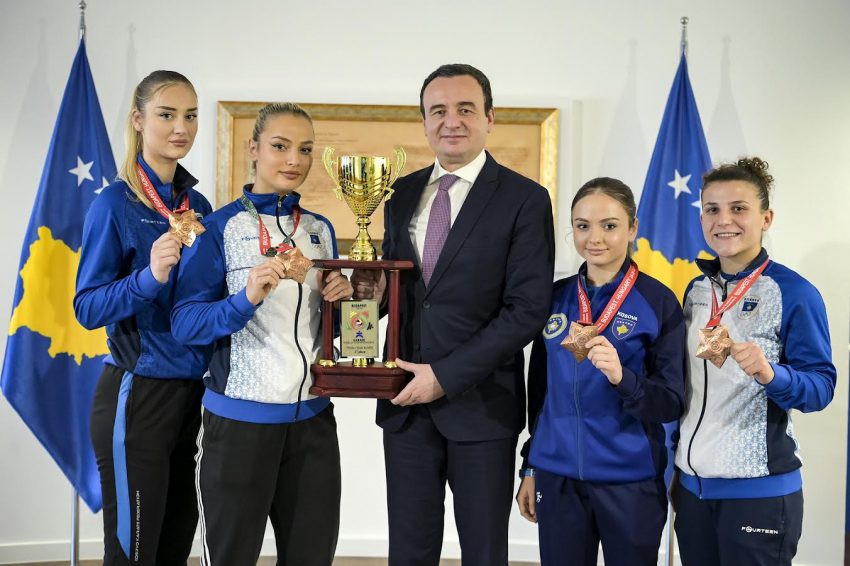 Kryeministri i Republikës së Kosovës, Albin Kurti, bashkë me zëvendësministren e Kulturës, Rinisë dhe Sportit, Daulina Osmani ka pritur sot në takim ekipin e Kosovës në karate, në konkurrencën e vajzave, i përbërë nga Fortesa Orana, Vlera Qerimi, Hatixhe Zejnullahu dhe Albulena Gervalla, i cili ka fituar medalje të bronztë në Kampionatin Botëror të Karatesë, që u mbajt nga 24-29 tetor në Budapest të Hungarisë.
