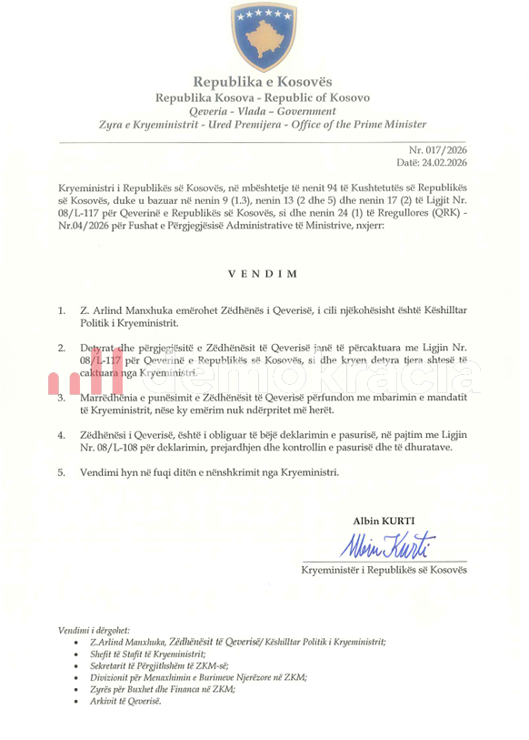 “Vendimi hyn në fuqi ditën e nënshkrimit nga Kryeministri. Vendimi i dërgohet: Z. Arlind Manxhuka, Zëdhënës i Qeverisë / Këshilltar Politik i Kryeministrit Shefit të Stafit të Kryeministrit. Sekretarit të Përgjithshëm të ZKM-së”.