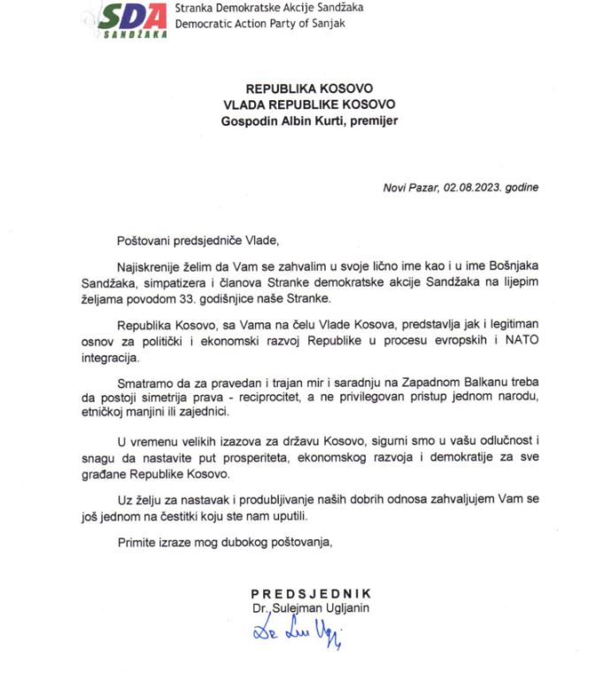 Kryeministri i Republikës së Kosovës, Albin Kurti, ka pranuar një letër falënderimi nga Kryetari i Partisë së Aksionit Demokratik të Sanxhakut, Dr. Sulejman Ugljanin, me rastin e urimit nga kryeministri të 33-vjetorit të themelimit të kësaj partie.