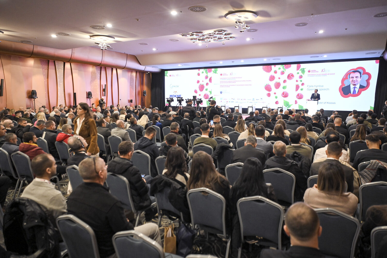 “Këtu kemi mbi 350 pjesëmarrës, kjo sallë tregon që frutat e më nuk është kulturë e vogël por është me ndikim. Janë edhe 30 fermerë nga Shqipëria që kanë marrë model fermerët e Kosovës. Kosova e sotme është histori suksesi që po forcohet nga viti në vit një vend më i sigurt në Evropë me sundim të ligjit në rritje kjo performancë nuk është rastësi është rezultat i reformave të qëndrueshme dhe përfshirje reale e të gjitha komuniteteve. Me rritje ekonomike solide sistem financiar të kapitalizuar dhe me paqe dhe siguri. Kjo klime stabiliteti është arsyeja qe sektori i frutave të imta po gjen tregje të reja dhe kontrata afatgjata. Thuhet se sekrete i suksesi në fermë është kombinimi i tokave pjellore dhe politikat e mençura. Sot Kosova ka ngritur një zinxhir të plotë me fruta të imëta nga punishtet në qendrat punese të cilët e kanë shndërruar bashkëpunimin në avantazh për shkak se punojmë më shumë. Dikur rreth 96 për qind i prodhimit tonë eksportohet sot falë rritjes së ndjeshme dhe orientimi drejtë ushqimit të shëndetshëm është eksporti rreth 75 për qind. Familjet tona po konsumojnë më shumë produkte vendore, unë si kryeministër jemi të interesuar t’iu mbështesim më shumë. Shumica e produktit shkon për eksport duke gjeneruar 10 milionë euro”, tha Kurti.