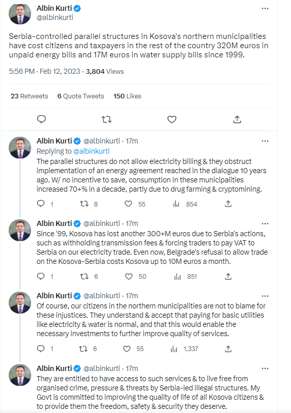 “Pa nxitje për të kursyer, konsumi në këto komuna u rrit me 70+% në një dekadë, pjesërisht për shkak të kultivimit të drogës dhe kriptominimit”, ka shkruar Kurti në Twitter.