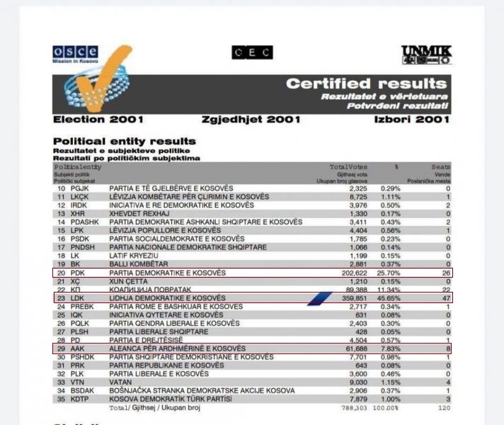 Asokohe Ibrahim Rugova pati lënë prapa Hashim Thaçin dhe PDK-në që morën 202 mijë e 622 vota dhe Ramush Haradinajn me AAK-në që mori rreth 62 mijë vota.