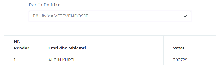 Kandidati i VV-së për kryeministër, Albin Kurti është i pari me 290 mijë e 729 vota, pa llogaritur këtu votat e disaporës dhe ato me kusht.