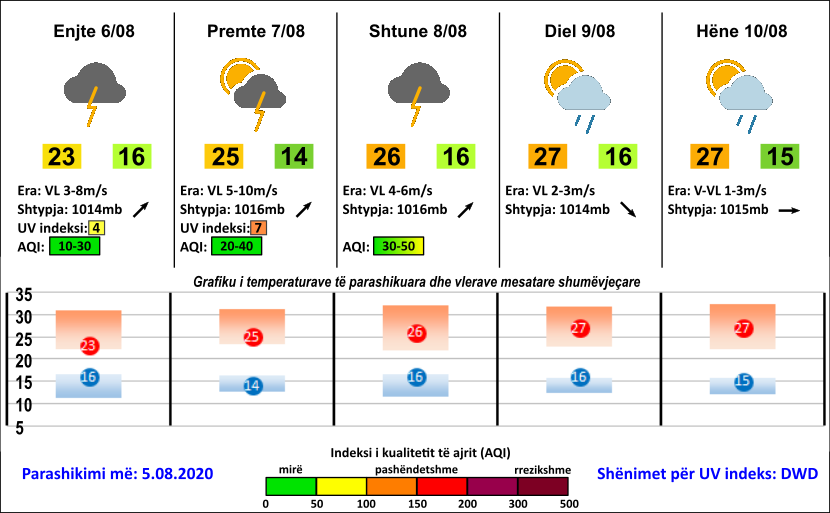 Sipas PW, indeksi i rrezeve UV ditën e enjte mbetet në vlera mesatare, e ditën e premte në vlera të larta.