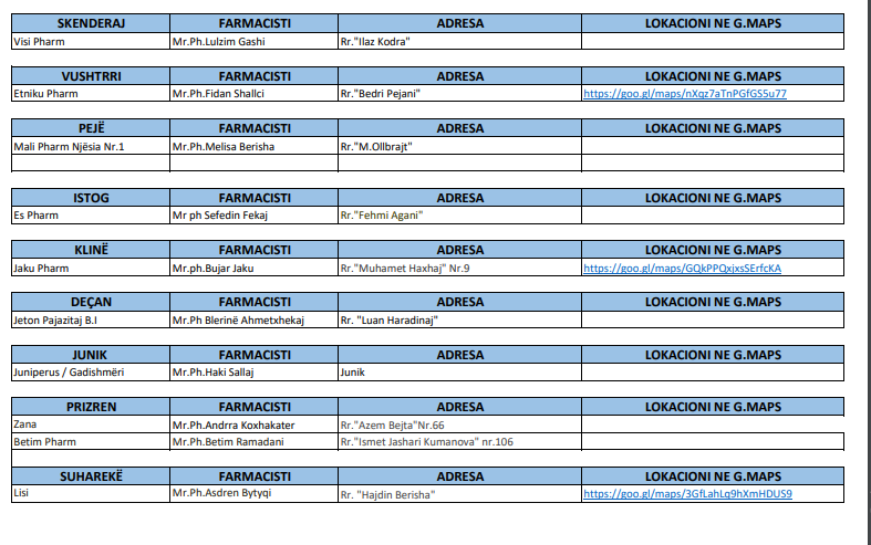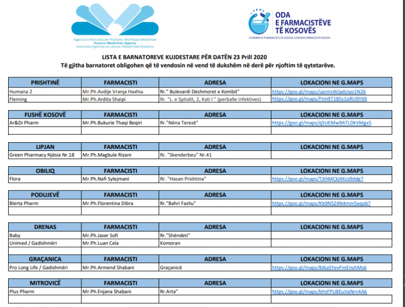 Këto janë oraret për të gjitha barnatoret kujdestare në gjithë Kosovën: