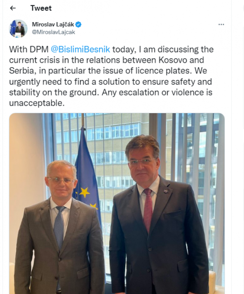 Emisari i BE-së për dialogun Kosovë-Serbi, Miroslav Lajcak ka njoftuar për takimin që ka pasur me zëvendëskryeministrin e Kosovës, Besnik Bislimin e me të cilin kanë diskutuar për krizën aktuale të raporteve në mes të Kosovës dhe Serbisë.