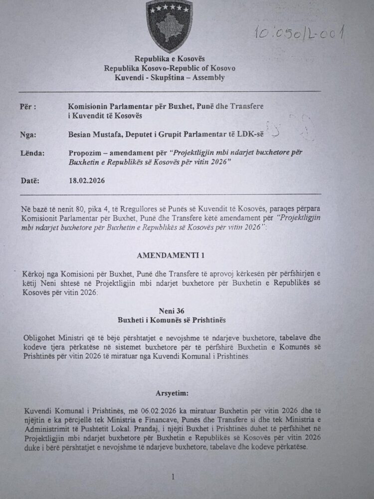 “Sot, do të paraqes zyrtarisht amendamentin për përfshirjen e buxhetit të Kryeqytetit në Ligjin për Buxhetin e Republikës për vitin 2026. Në Komisionin Parlamentar për Buxhet në orën 13:00, përtej arsyetimit të kërkesës si përfaqësues i LDK-së, do të provoj të ndërtoj pajtueshmëri me të gjitha partitë parlamentare sepse Prishtina nuk u përket vetëm banorëve të saj, por mbarë Kosovës. Si qendra jonë kryesore ekonomike, akademike, shëndetësore dhe administrative, infrastruktura e kryeqytetit përballon çdo ditë një fluks masiv të qytetarëve nga çdo komunë tjetër. Zhvillimi i Prishtinës, rregullimi i infrastrukturës dhe përmirësimi i shërbimeve të saj, ndikon drejtpërdrejt në jetën e qindra mijëra qytetarëve që punojnë, studiojnë apo marrin shërbime këtu. Mbështetja e këtij amendamenti nuk duhet të shihet si një favor lokal apo betejë politike, por si një domosdoshmëri për një shtet më funksional. Kur bëhet fjalë për Kryeqytetin tonë, besoj fort se interesi i përgjithshëm shtetëror duhet të lartësohet mbi çdo ngjyrë apo ndasi partiake”, ka shkruar Mustafa.
