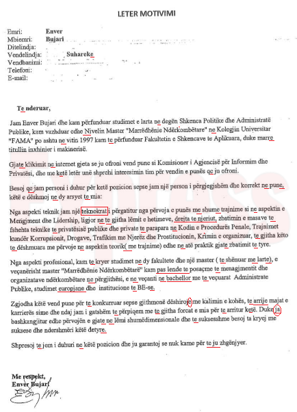 Në letrën e tij motivuese, aty ku supozohet të shkruhet për ambicie, përvojë e personalitet, Bujari zgjodhi të thotë se përvoja e punës e ka bërë “teknokrat”, ndërkohë që po fliste për aftësi teknike.