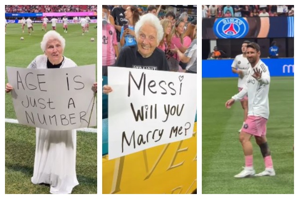Mbrëmë ajo u paraqit me një pankartë me mbishkrimin: “Mosha është vetëm një numër”, ndërsa në dorë mbante edhe një trëndafil të kuq. Më pas kishte një pankartë tjetër: “Unë e dua Mesin”.