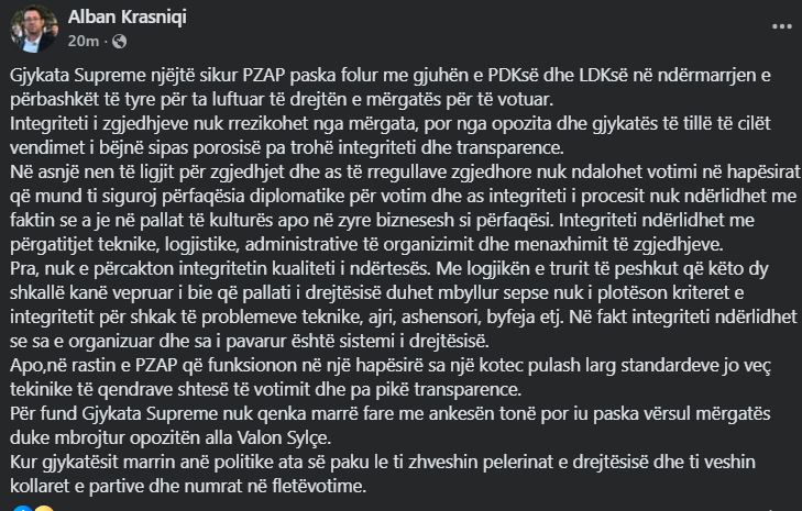 “Pra, nuk e përcakton integritetin kualiteti i ndërtesës. Me logjikën e trurit të peshkut që këto dy shkallë kanë vepruar i bie që pallati i drejtësisë duhet mbyllur sepse nuk i plotëson kriteret e integritetit për shkak të problemeve teknike, ajri, ashensori, byfeja etj. Në fakt integriteti ndërlidhet se sa e organizuar dhe sa i pavarur është sistemi i drejtësisë. Apo, në rastin e PZAP që funksionon në një hapësirë sa një kotec pulash larg standardeve jo veç teknike të qendrave shtesë të votimit dhe pa pikë transparence. Për fund Gjykata Supreme nuk qenka marrë fare me ankesën tonë por iu paska vërsul mërgatës duke mbrojtur opozitën alla Valon Sylçe. Kur gjykatësit marrin anë politike ata së paku le ti zhveshin pelerinat e drejtësisë dhe ti veshin kollaret e partive dhe numrat në fletëvotime”, ka shkruar Krasniqi.