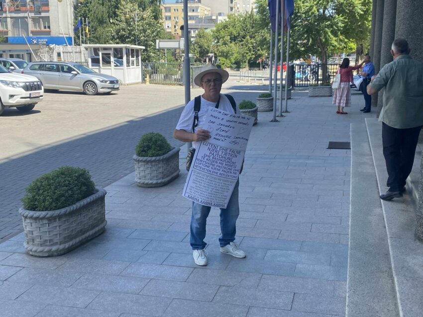 Në prag të seancës së 46-të për konstituimin e Kuvendit të Kosovës, një qytetar protestoi paqësisht para godinës me një pankartë në dorë që përmbante mesazhin: “Luteni dhe faleni njëri-tjetrin”, raporton Ekonomia Online.
