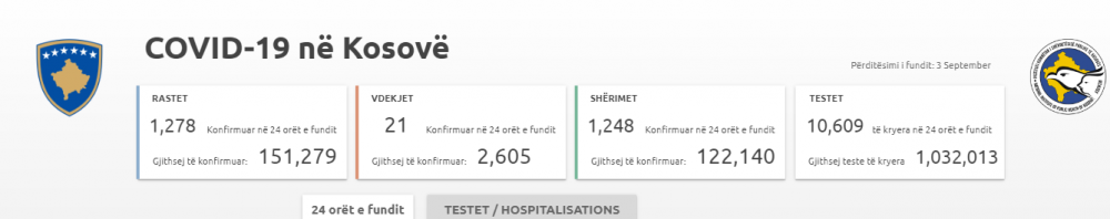 Ndryshe, Shërbimi Spitalor dhe Klinik Universitar i Kosovës ka bërë të ditur se më 4 shtator në spitalet dhe klinikat ku trajtohen pacientët me koronavirus janë të shtrirë 1.171 pacientë, prej tyre 1.044 janë të konfirmuar me koronavirus.
