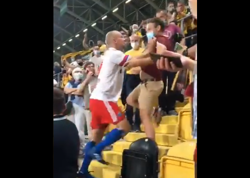 Një video e shpërndarë me të madhe në rrjetet sociale, e shfaq Leistnerin – i cili iu bashkua klubit nga Bundesliga 2 nga QPR-ja muajin e kaluar – duke e shtyrë me të dy duart një tifoz në tribunat e stadiumit Rudolf-Harbig dhe duke argumentuar me të tjerët ulur atypari, transmeton Gazeta Express.