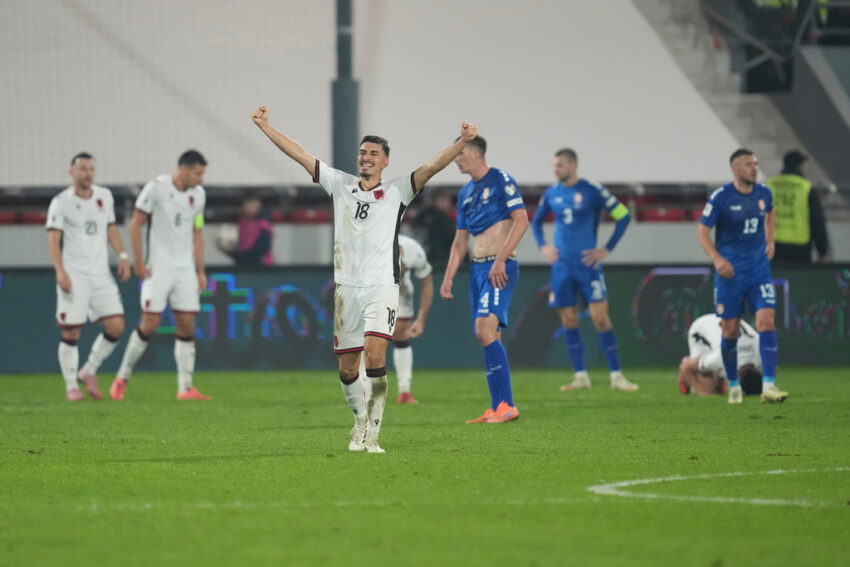 Albania's Ardian Ismajli celebrates after the World Cup Group K qualifying soccer match between Serbia and Albania, at the Dubocica Stadium in Leskovac, Serbia, Saturday, Oct. 11, 2025. (AP Photo/Darko Vojinovic)
