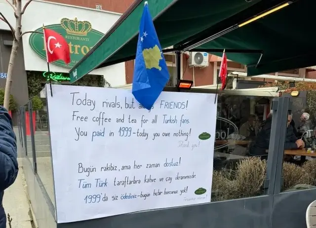 Mediumi AjanSpor, ka treguar sesi në një kafenr në Prishtinë janë vendosur së bashku flamujt e Kosovës dhe Turqisë, ndërsa në një baner në gjuhën angleze dhe turke shkruhej: “Sot jemi rivalë, por gjithmonë miq! Kafe dhe çaj falas për të gjithë tifozët turk. Në vitin 1999 ju keni paguar – sot nuk keni asnjë borxh”.
