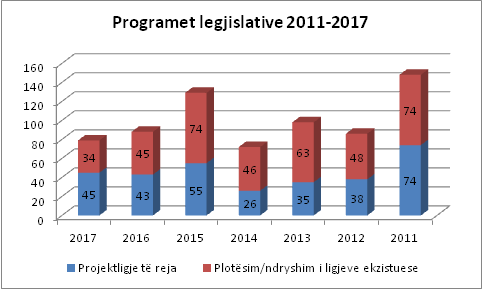 Në krahasim me vitin 2016 por edhe me vitet tjera kur kryesisht më shumë janë planifikuar projektligje për plotësim/ndryshim të ligjeve ekzistuese sa sa ligje të reja, programi legjislativ 2017 parasheh më shumë ligje të reja se sa ndryshime të ligjeve ekzistuese.