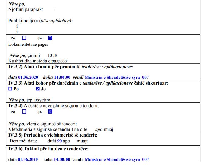 Të gjitha kompanitë e interesuara për këtë tender, kanë afat që t’i dorëzojnë ofertat e tyre deri më 1 qershor në ora 14:00, në Ministrinë e Shëndetësisë.