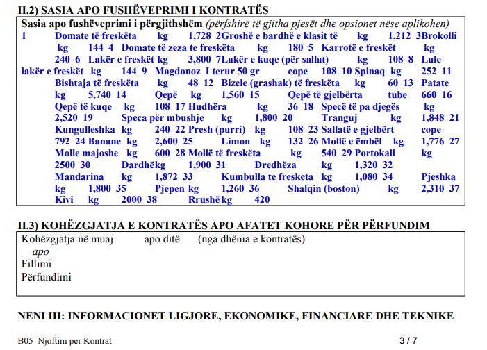 Përmes njoftimit për kontratë të publikuar në faqen zyrtare të Komisionit Rregullativ të Prokurimit Publik, MSh’ja ka njoftuar se këto institucione kanë nevojë për t’u furnizuar domate, groshë, brokoli, lakër të freskët, lulelakër, majdanoz, spinaq, bizele, qepë, hudhër, speca, tranguj, kungulleshka, presh.
