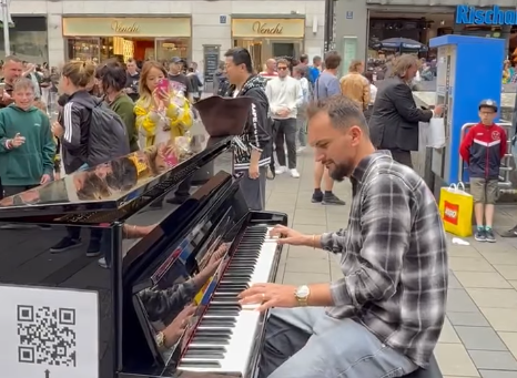 Ai shihet në mes të një sheshi në Mynhen i rrethuar nga qytetarë që ndalen e dëgjojnë .