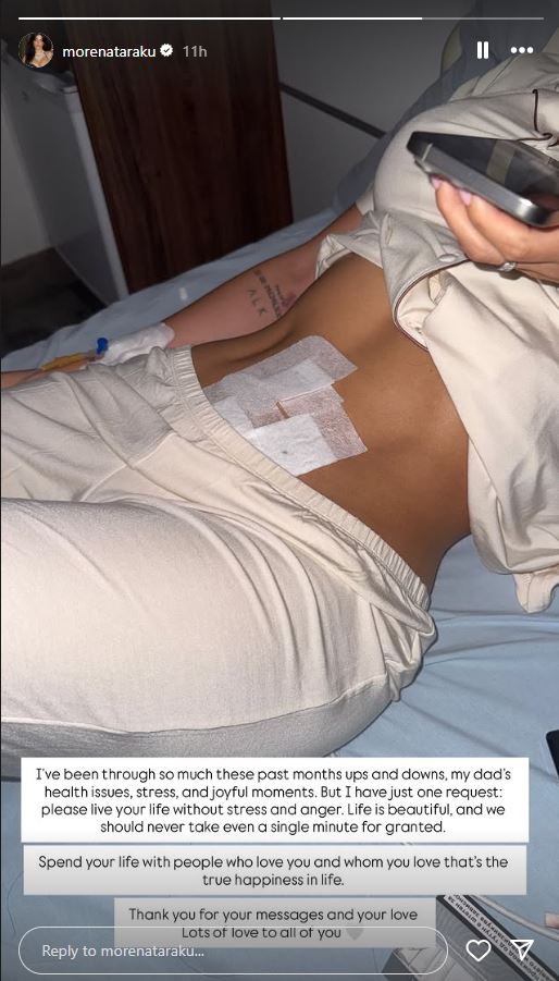 Këngëtarja dhe modelja e njohur, Morena Taraku ka publikuar një fotografi nga spitali, ku shihet me një me një fashë në zonën e barkut.