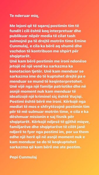 Përmes një shkrimi të gjatë në Instagram, ajo i ka kërkuar falje shqiptarëve por veprimin e ka ndërlidhur me “sarkazmë”.