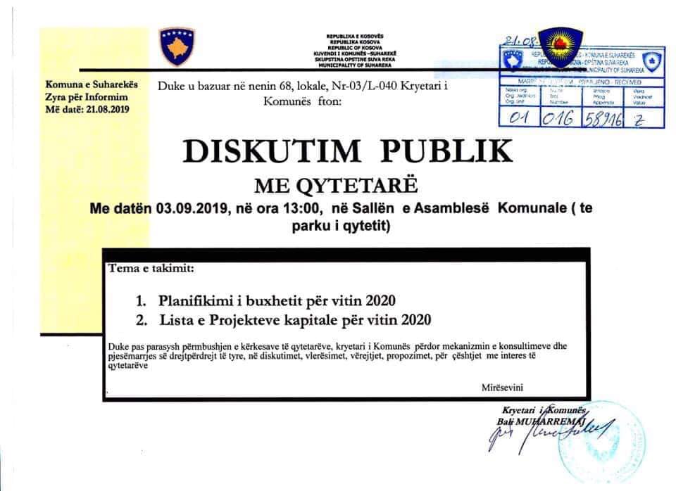 Kryetari i Komunës së Suharekës Bali Muharremaj ka ftuar qytatarët e Suharekës në diskutim publik,që do të mbahet sot në ora 13:00.