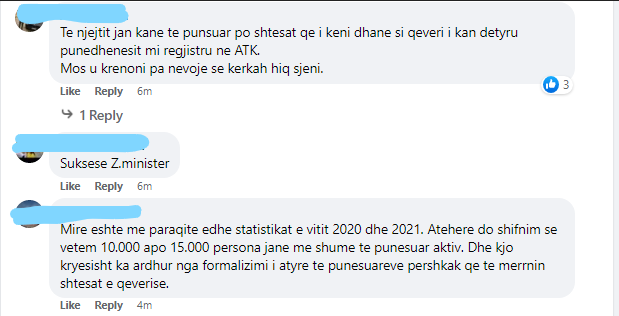 “Te njejtit jan kane te punsuar po shtesat qe i keni dhane si qeveri i kan detyru punedhenesit mi regjistru ne ATK. Mos u krenoni pa nevoje se kerkah hiq sjeni”, është një koment tjetër te postimi i Muratit.