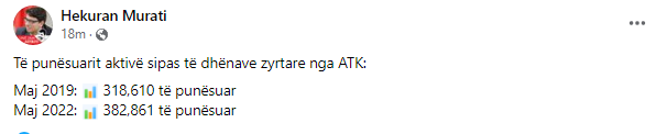 Në statistikat e publikuara nga Murati, krahasohet numri i të punësuarve aktivë në muajin maj 2019 me atë të majit të vitit 2022. Në maj të vitit 2019 thuhet se ishin 318 mijë e 610 të punësuar, derisa në maj të këtij viti 382 mijë e 861 të punësuar.