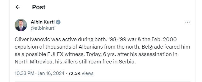 “Oliver Ivanoviq ishte aktiv gjatë të dyjave: luftës ’98-‘99 dhe dëbimit të shkurtit 2000 të mijëra shqiptarëve nga veriu. Beogradi i frikësohej atij si dëshmitar të mundshëm të EULEX-it. Sot, 6 vjet pas vrasjes së tij në Mitrovicën e Veriut, vrasësit e tij ende enden të lirë në Serbi”, kishte shkruar Kurti.