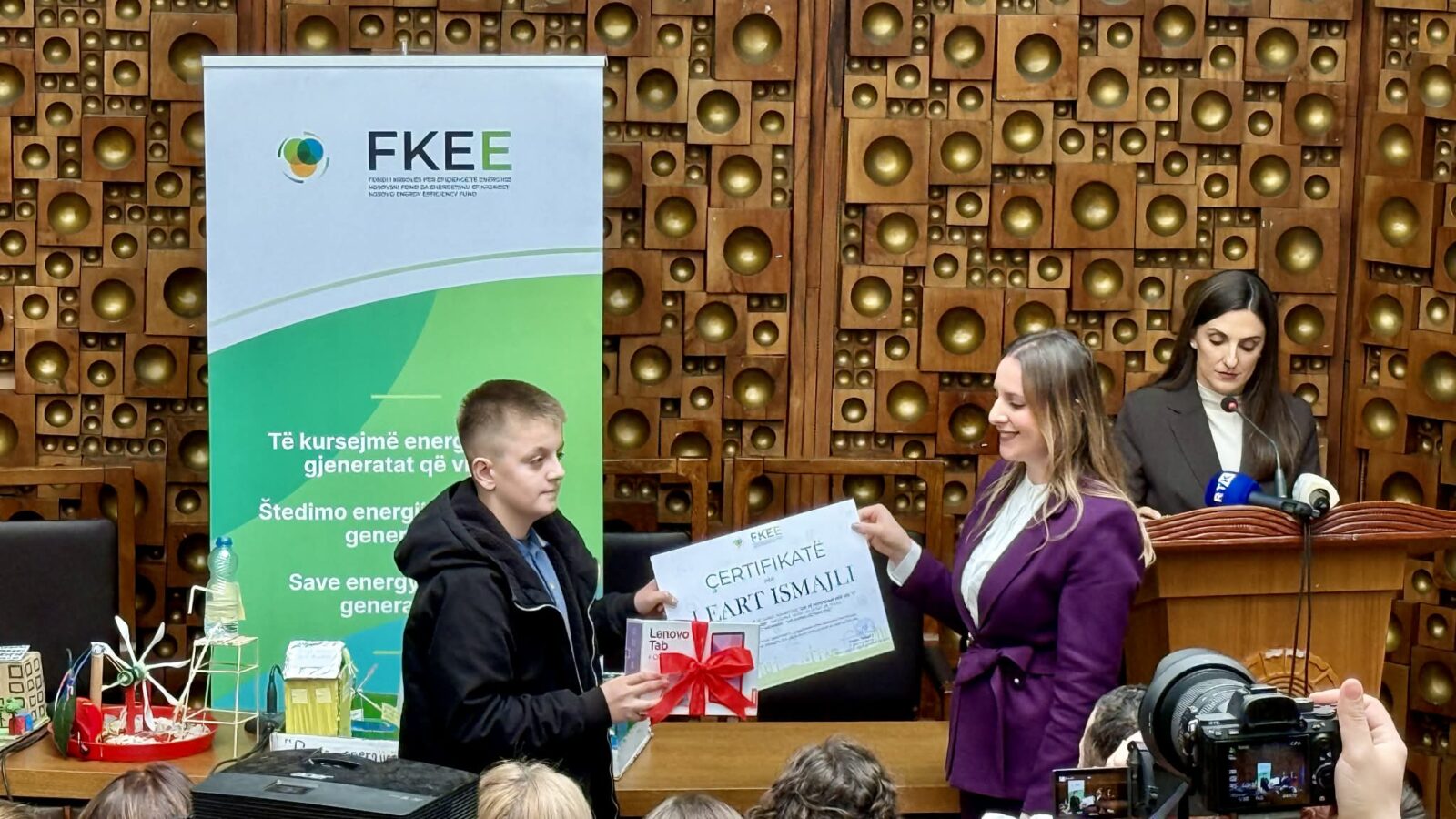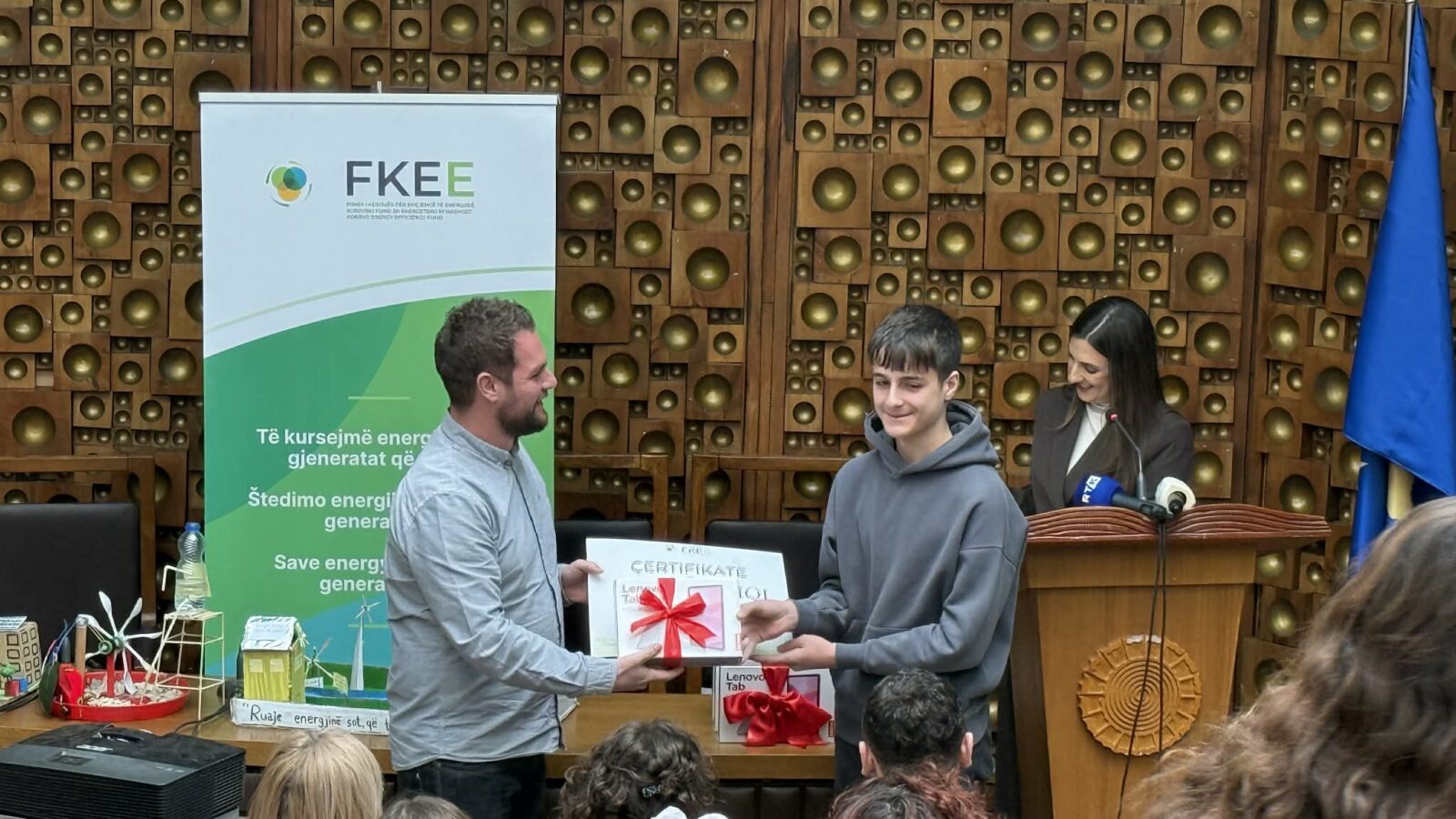 Fondi i Kosovës për Efiçiencë të Energjisë ka mbajtur ceremoninë e ndarjes së çmimeve për fituesit e Konkursit Nacional “Ide të ndritshme për një të ardhme të gjelbër”, ku në kategorinë “Për rezervë një e nesërme e gjelbër” dhe “vizioni im për energjinë dhe energjinë e ripërtëritshme”, u shpërblye Erion Veliqi nga Prishtina, nxënës në shkollën “Ismail Qemajli”, në klasën e 9-të. Ndërsa çmimin e parë për kategorinë instilacion me temën “Shpikja ime e qëndrueshme” iu dha Aldin Bushit, nxënës i klasës së 9-të në shkollën “Izal Thaci” në Han të Elezit, raporton Ekonomia Online.