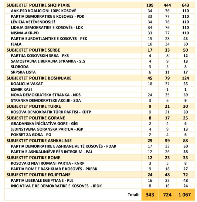 Numri i përgjithshëm i kandidatëve të certifikuar është: 1 067 kandidatë për deputetë (343 femra dhe 724 meshkuj).