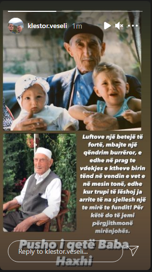 Klestor Veseli, djali i ish-kryeparlamentarit Kadri Veseli, ka shkruar fjalë prekëse për gjyshin e tij, që vdiq sot.