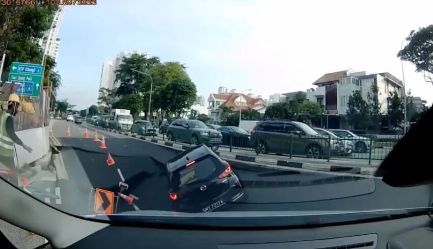 Një rrugë e sapo asfaltuar në Singapor, papritmas ka “përpirë” një makinë.