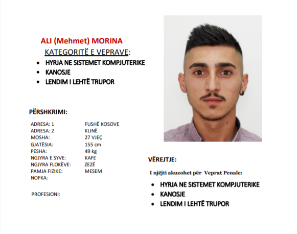Personi i kërkuar është ALI (Mehmet) MORINA i lindur me 04.08.1993 nё fshatin Dresnik- Klinë.