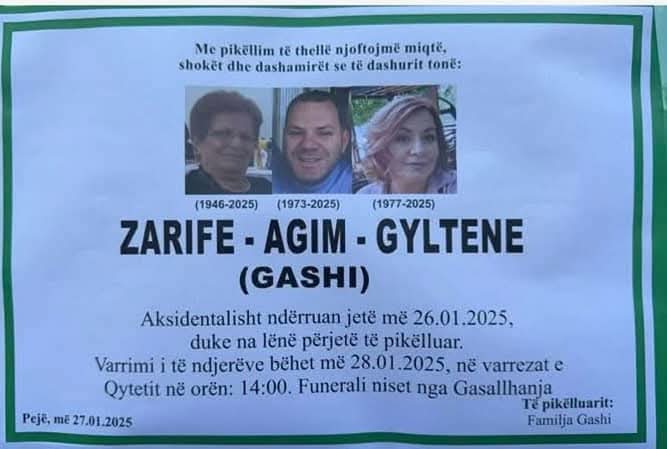 Zarife, Agim dhe Gyltene Gashi mbetën të vdekur si pasojë e këtij aksidenti.