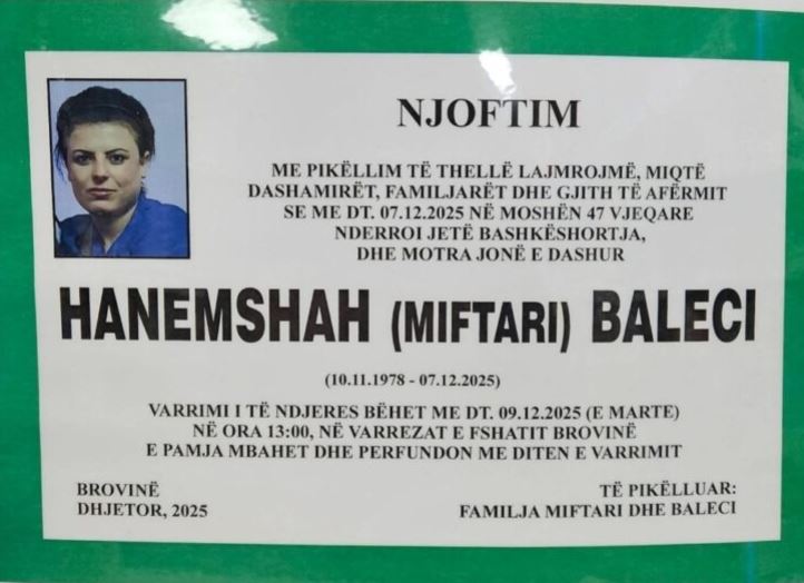 Ceremonia e varrimit të 47 vjeçares Hanumshahe Miftari, do të mbahet në ora 13:00 në fshatin Brovinë.