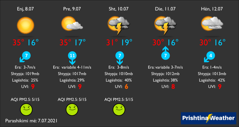 10.07 – Mbetet nxehtë, me vransira e diell. Nga mesdita priten zhvillime të rrebesheve me bubullima. Vende-vende reshjet ka mundësi të jenë intenzive.