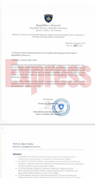 Ministrja Gërvalla në këtë dokument dërguar kryetarit të këtij komisioni, Haki Abazi thotë se Blerim Reka i plotëson të gjitha kritetret për të shërbyer si Konsull i Përgjithshëm i Kosovës në New York.
