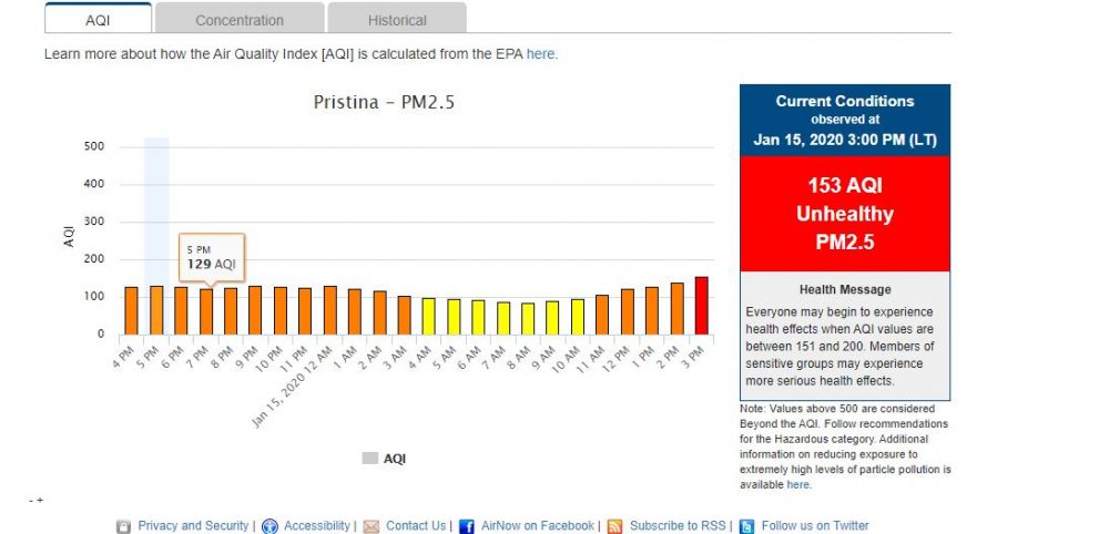 Sipas matësit të vendosur nga Ambasada e SHBA-ve në Prishtinë, ndotja aktualisht shënon nivelin prej 153 PPM.