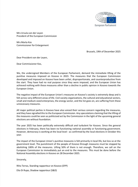 Një grup i deputetëve të Parlamentit Evropian (MEP) i kanë dërguar një letër Presidentes së Komisionit Evropian, Ursula von der Leyen dhe Komisioneres për Zgjerim, Marta Kos, duke i bërë thirrje që të heqin menjëherë të gjitha masat e vendosura ndaj Kosovës.