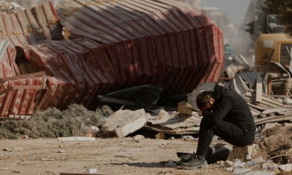 A man reacts as people search the rubble of collapsed apartment blocks for personal belongings, in the aftermath of a deadly earthquake, in Kahramanmaras, Turkey, February 18, 2023. REUTERS/Clodagh Kilcoyne